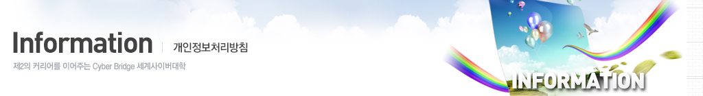 세계사이버대학(https://www.world.ac.kr 이하‘본교’)가 취급하는 모든 개인정보는 관련법령에 근거하거나 정보주체의 동의에 의하여 수집·보유 및 처리되고 있습니다.[개인정보보호법]은 이러한 개인정보의 취급에 대한 일반적 규범을 제시하고 있으며, 세계사이버대학는 이러한 법령의 규정에 따라 수집/보유 및 처리하는 개인정보를 공공업무의 적절한 수행과 국민의 권익을 보호하기 위해 적법하고 적정하게 취급할 것입니다.